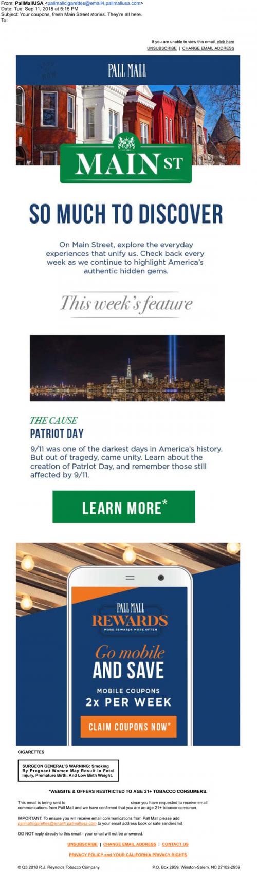 Email from Pall Mall in September 2018 promoting the Main St. feature on the brand website for more of "America's authentic hidden gems." Mentions an article about Patriot's Day (9/11) and provides a link to claim mobile coupons.