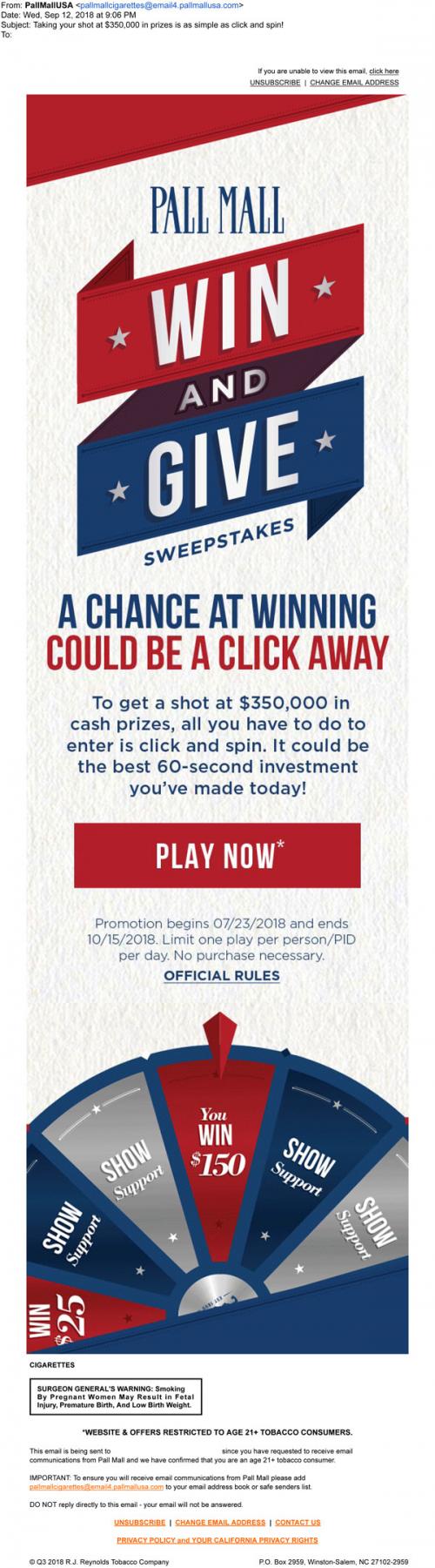 Email from Pall Mall in September 2018 promoting the Win and Give sweepstakes. Includes a link to the brand website to enter and reminds the recipient that the brand is donating to support veterans.