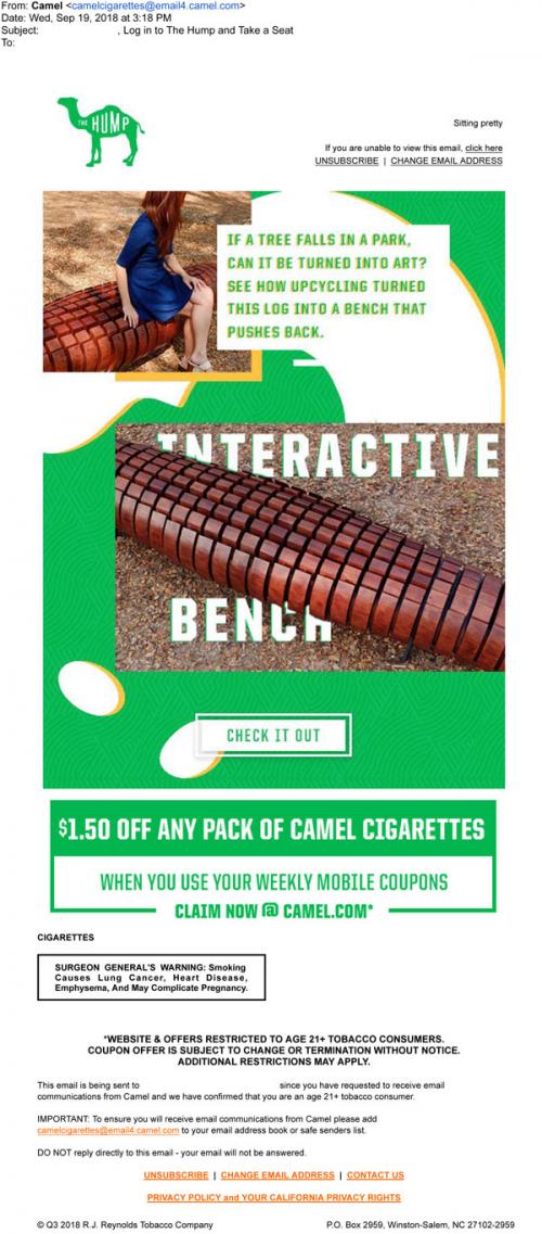 Email from Camel in September 2018 with a new feature article from The Hump about interactive park benches. Also provides a link to claim weekly mobile coupons from the brand website.
