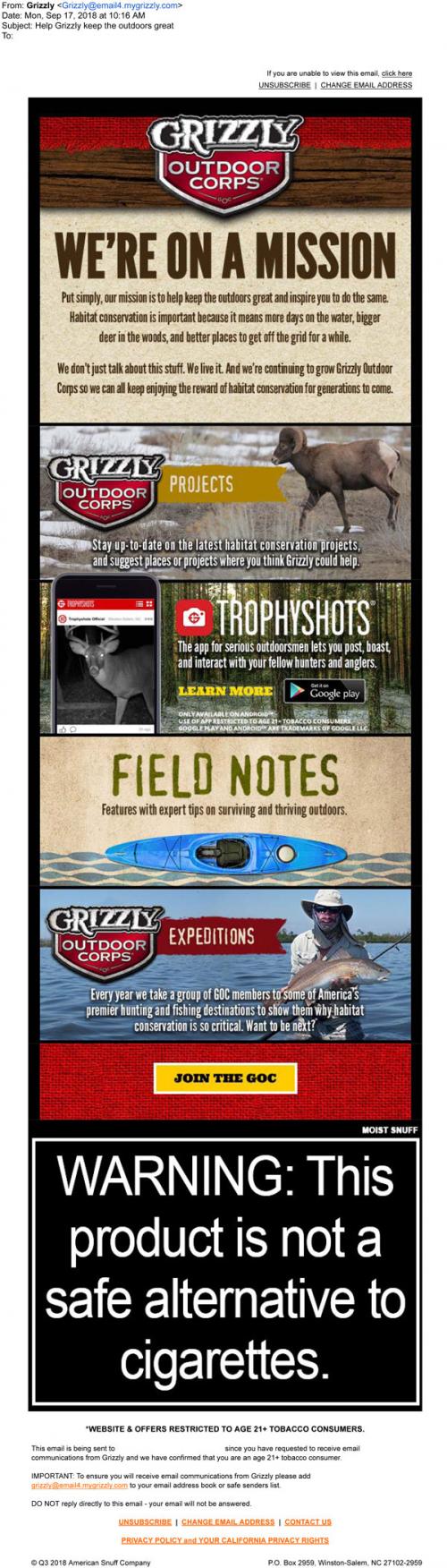 Email from the Grizzly Outdoor Corps in September 2018 promoting their mission, environmental projects, the TrophyShots app, Field Notes features, and the opportunity to participate on hunting and fishing expeditions with the brand. Provides a link to join and receive updates.