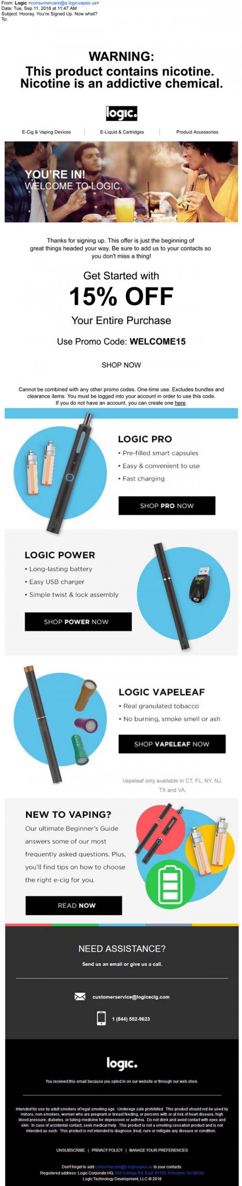 Email from Logic in September 2018 welcoming a new customer and thanking them for signing up. Includes a promo code to use on the brand website and links to different types of vape products they offer, as well as a guide to using and choosing e-cigs.