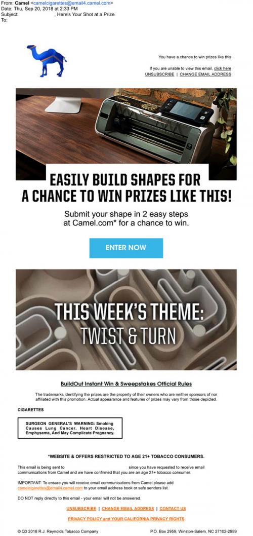 Email from Camel in September 2018 promoting the BuildOut sweepstakes, with a link to the brand website to create a 3D shape to fit this week's theme. Also shows possible prizes to win.