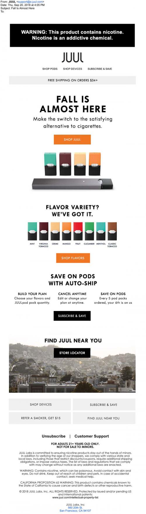 Email from JUUL in September 2018 announcing the arrival of fall and linking to the brand website to "make the switch" by buying their devices and flavored pods. Also describes how a customer can save with their auto-ship program, and get a free pack of pods for every 5 ordered. Provides links to learn more about their smoker referral bonus and use a store locator.