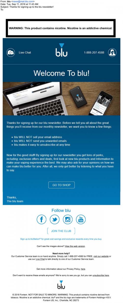 Welcome email from blu in September 2018 thanking the customer for signing up for the brand newsletter. Also provides links to the brand's social media accounts to follow.