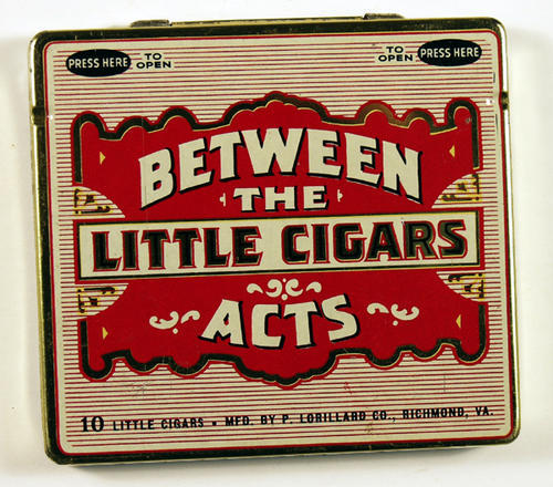 Empty tin "Between the Acts Little Cigars" vintage style. 10 count. Lorillard. Small. From Middlesex County garage sale.