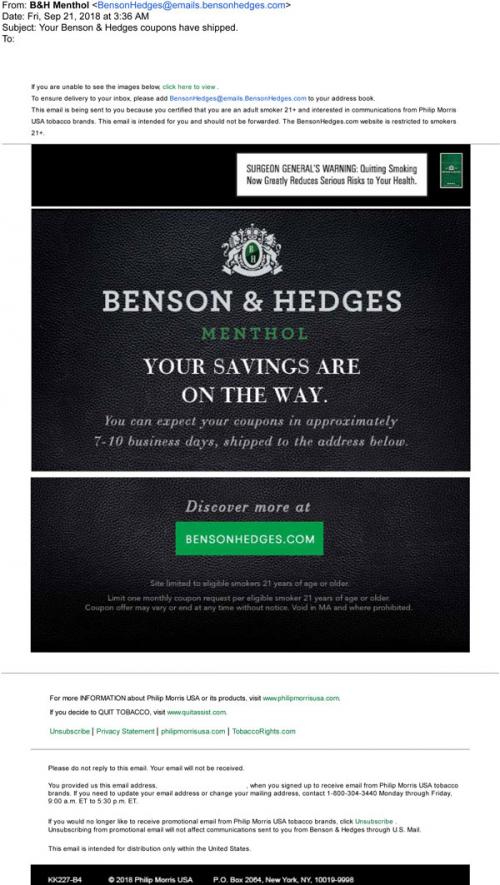 Email from Benson & Hedges menthol in September 2018 letting the recipient know that direct mail coupons have been sent to the address on file and should be arriving soon. Directs a link back to the brand website to discover more.
