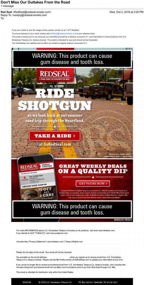 Email from Red Seal in October 2018 inviting the recipient to check out the brand's summer road trip through the Heartland on the brand website. Also provides a link to claim weekly mobile coupons.