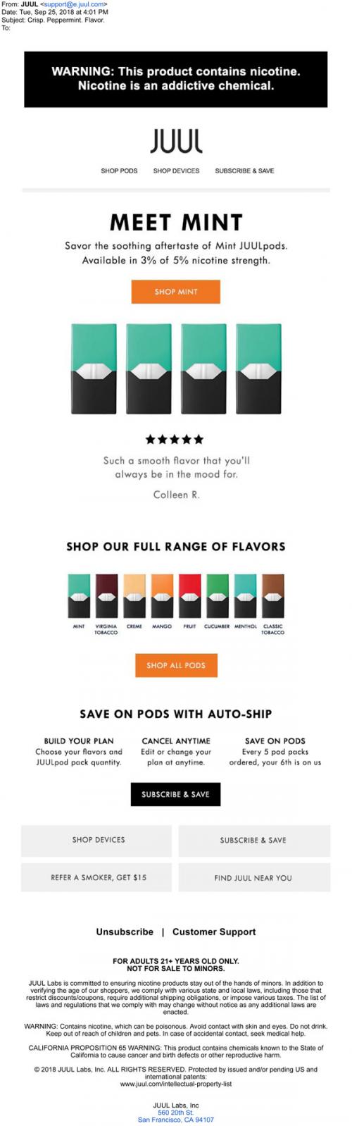 Email from JUUL in September 2018 highlighting their mint flavored pods, now available in 3% and 5% nicotine strengths. Includes a link to check out all their flavors, and subscribe to their auto-ship program to get a free pack for every 5 orders. Also links to the smoker referral program and the store locator.