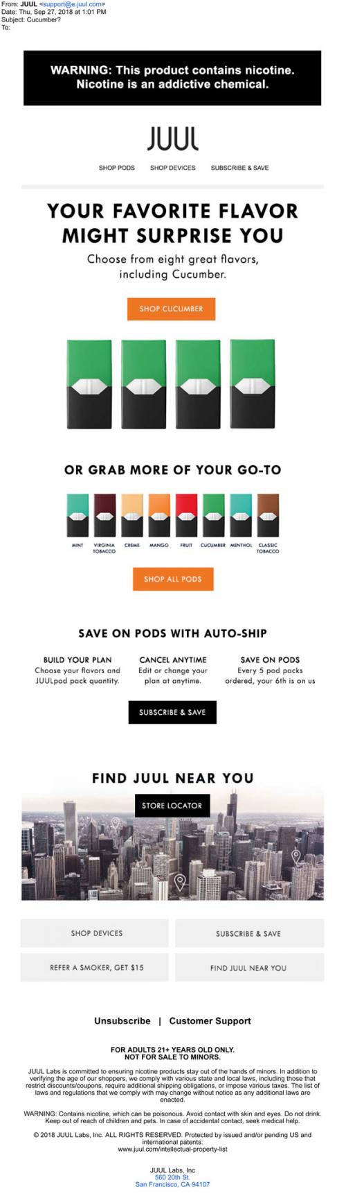 Email from JUUL in September 2018 highlighting their cucumber flavor, and providing links to look at more of their flavor offerings or subscribe to their auto-ship program. Also links to a store locator and to learn more about their smoker referral program.