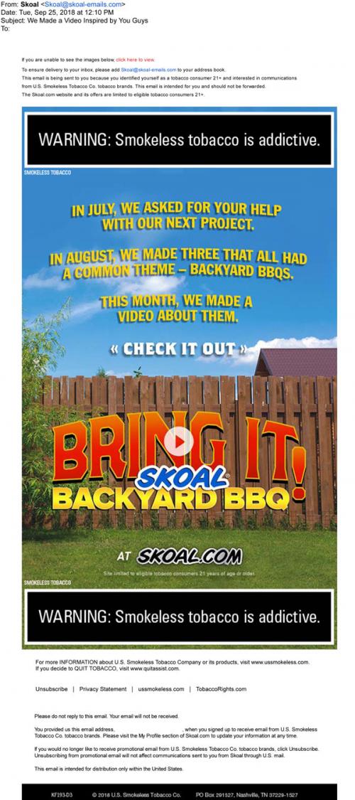 Skoal email in September 2018 with a link to check out a BBQ themed video on the brand website, featuring DIY projects, called "Bring It!"