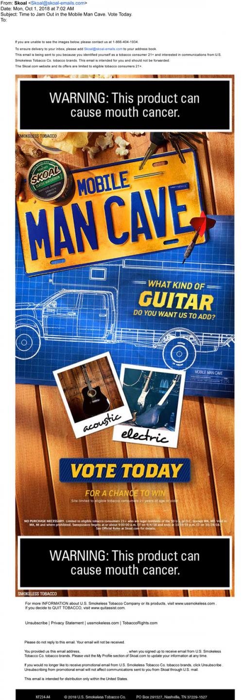 Email from Skoal in October 2018 looking for a vote on what kind of guitar they should include in the prize for the Mobile Man Cave sweepstakes. Provides a link to visit the brand website and enter.