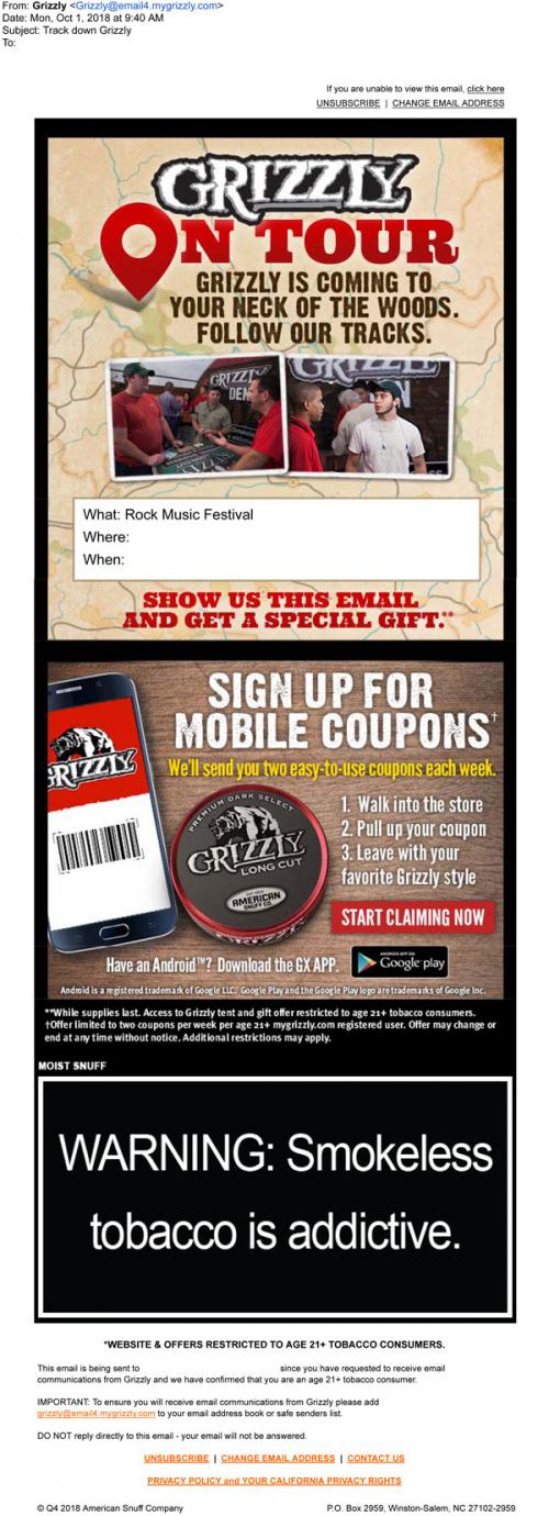 Email from Grizzly in October 2018 announcing a nearby rock music festival the brand will be visiting; if the customer shows the email at the location, they can receive a free gift. Also promotes weekly mobile coupons.