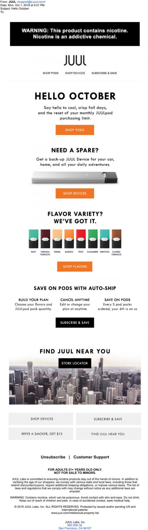 Email from JUUL in October 2018 greeting the fall, with links to buy pods, devices, and subscribe to their auto-ship program to get free pods. Also links to the store locator and their smoker referral bonus program.