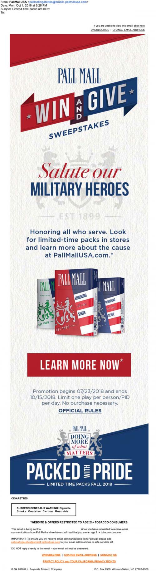 Email from Pall Mall in October 2018 with a limited time pack design to celebrate America's military heroes, as part of a promotion for the Win and Give sweepstakes. Links to the brand website to learn more.