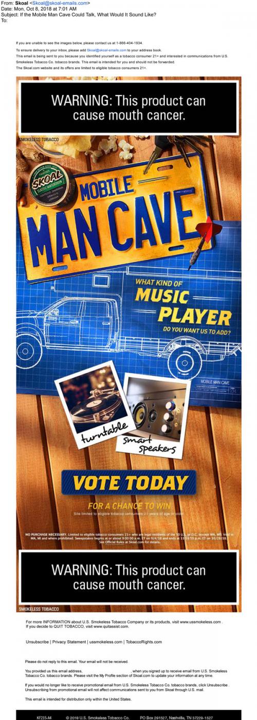 Email from Skoal in October 2018 promoting the Mobile Man Cave sweepstakes, with the next option to vote on: what kind of music player they should add to the prize. Links to the brand website to vote and enter.