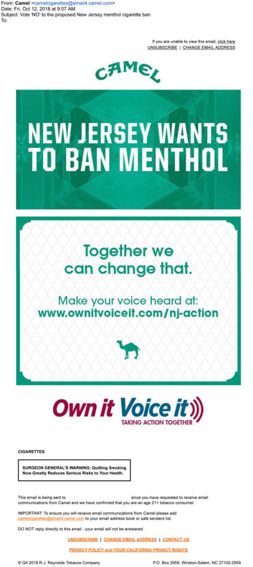 Email from Camel in October 2018 announcing proposed legislation to ban the sale of