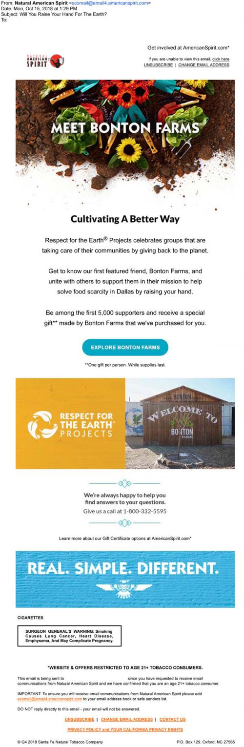 Email from American Spirit in October 2018 introducing their first partner in the Respect the Earth projects, a community farm group called Bonton Farms working to help solve food scarcity in Dallas. Provides a link to the brand website to learn more and claim a free gift by being one of the first supporters. Includes a reminder to learn more about coupons online as well.