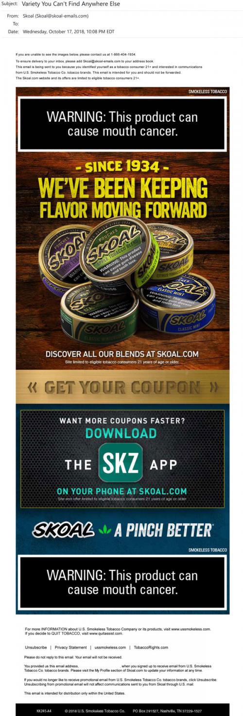 Email from Skoal in October 2018 with links to learn more about their flavored blends and claim coupons on the brand website, or even download the SKZ app to get mobile coupons faster.