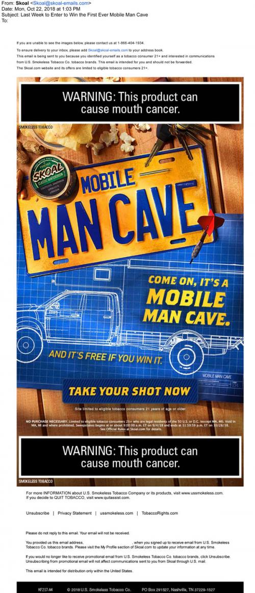 Email from Skoal in October 2018 reminding the recipient that it's the last week to enter the Mobile Man Cave giveaway; provides a link to the brand website to enter.