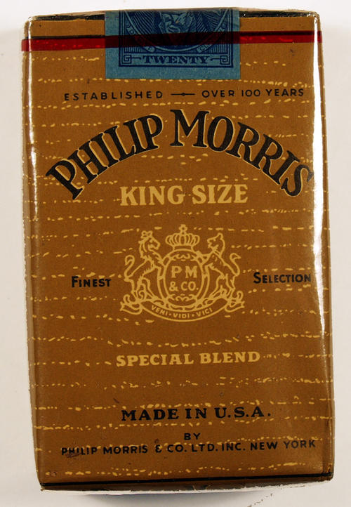 Philip Morris - King Size special blend. Made in USA. 20 count, tobacco leaf colored wrapping.