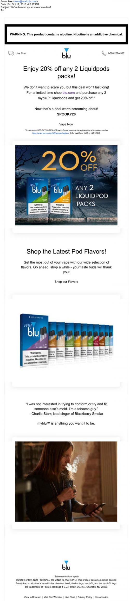 Email from blu in October 2018 announcing a Halloween sale on myblu pods, with a discount code to use on the brand website. Shows a lineup of flavors available and has a celebrity promo by Charlie Starr, a musician.