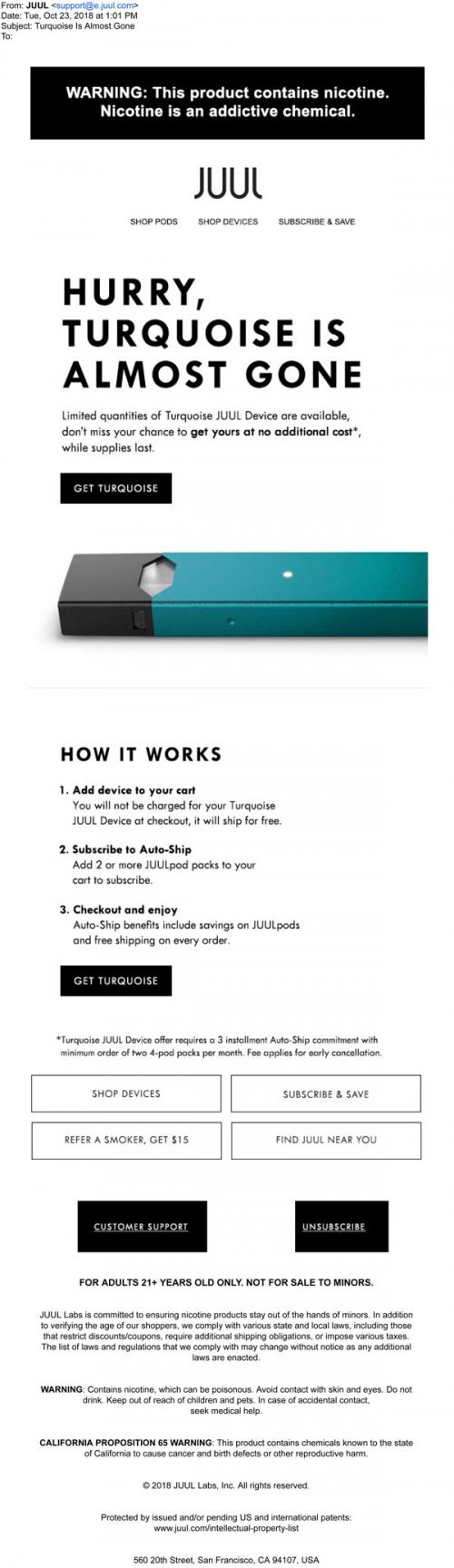 Email from JUUL in October 2018 reminding the recipient to sign up for the auto-ship program to get their free turquoise device. Also includes links to check out the smoker referral program and a store locator on the brand website.