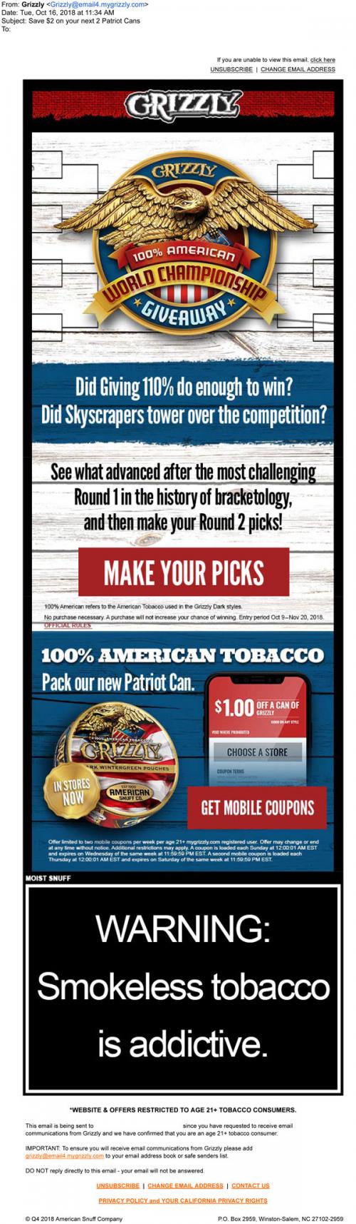 Email from Grizzly in October 2018 with a link to the brand website to enter the 100% American World Championship. Also promotes mobile coupons and the limited time Patriot can.