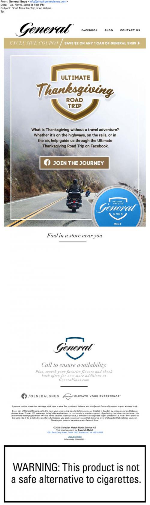 General Snus email in November 2018 promoting the Ultimate Thanksgiving Road Trip that will be posted on social media (Facebook) during the month, with a link to claim monthly coupons and nearby store locations.