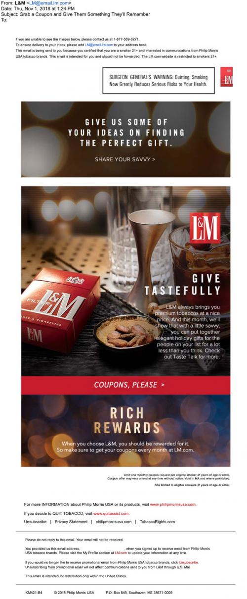 L&M email from November 2018 that invites customers to share their gift-giving ideas on the brand website, links to check out tips about holiday gifts, and to claim coupons.