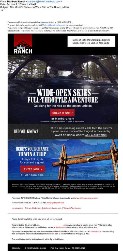 Email from Marlboro in November 2018 with links to learn more about the Marlboro Ranch and ask questions, as well as a chance to enter to win a trip.