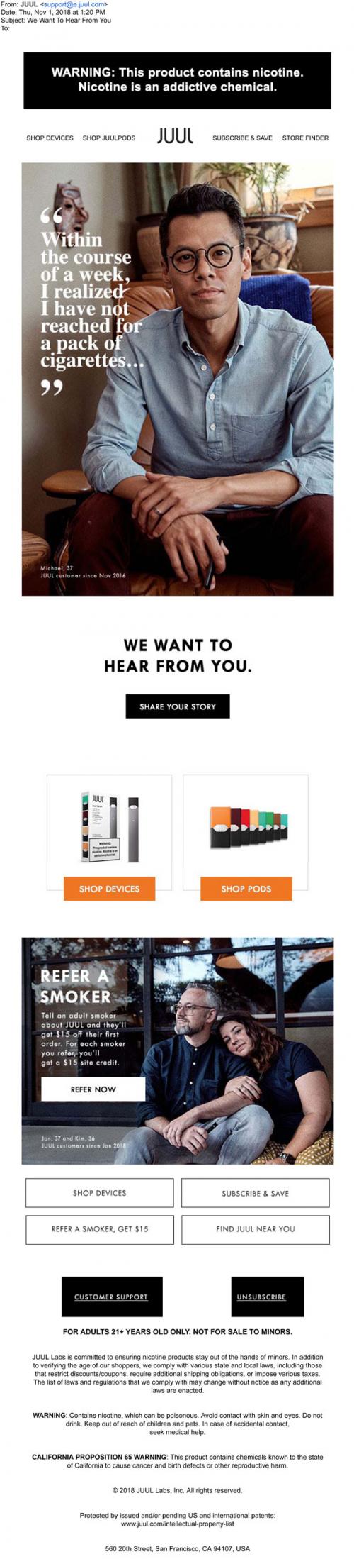 Email from JUUL in November 2018 soliciting for customer testimonials. Also links to the brand website to shop and learn more about the smoker referral program, subscribe to auto-ship, and use a store locator.