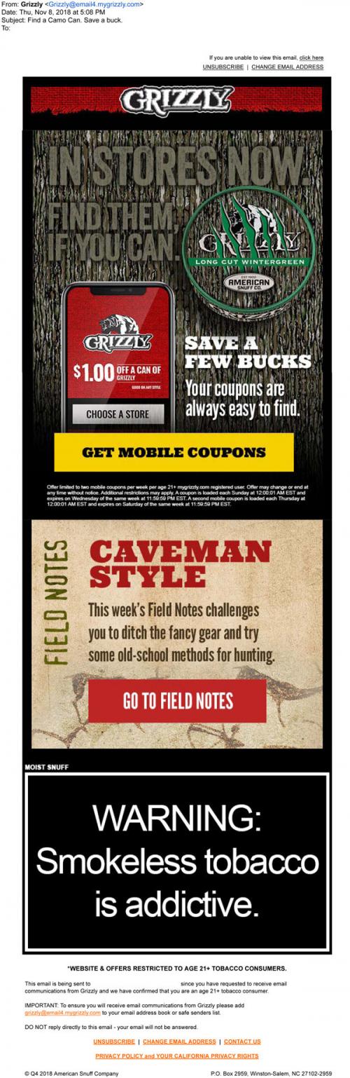 Email from Grizzly in November 2018 promoting the newest camo cans and mobile coupons. Also links to a Field Notes article about low tech hunting.