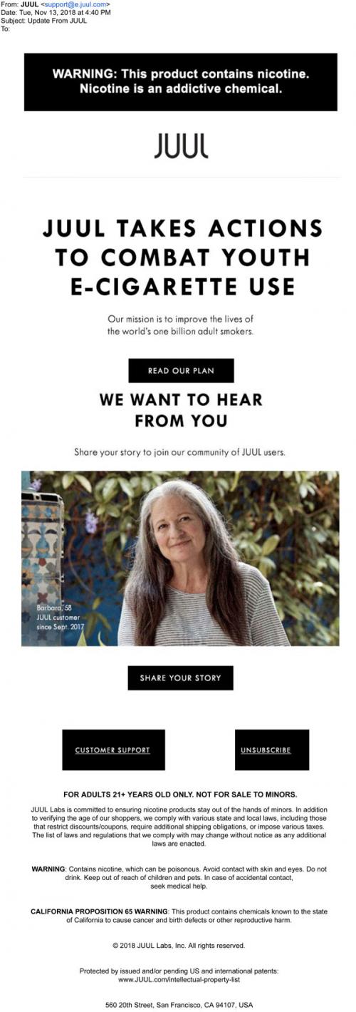 Email from JUUL in November 2018 linking to the brand's plan to combat youth e-cig use. Also solicits consumer feedback on the "community" center of the brand website.