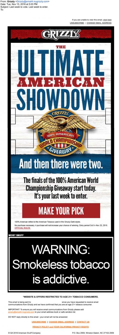 Email from Grizzly in November 2018 reminding the recipient about the last week to enter the 100% American World Championship giveaway on the brand website.