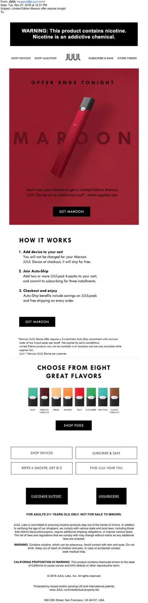 Email from JUUL in November 2018 promoting a free limited edition maroon device with a subscription to their autoship program. Includes a lineup of their favor offers, and provides links to shop, refer a smoker, and use a store locator.
