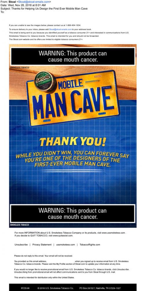 Email from Skoal in November 2018 thanking the recipient for participating in the Mobile Man Cave sweepstakes.