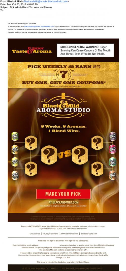 Email from Black & Mild in October 2018 inviting the recipient to vote in the Aroma Studio brackets to help decide which blend will be available in stores; each vote will gain the participant a coupon.