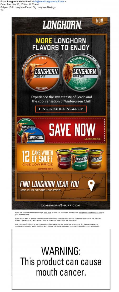 Email from Longhorn in November 2018 promoting peach and wintergreen chill flavors, and linking to the brand website to claim coupons, learn more about their tub products, and to use a store locator.