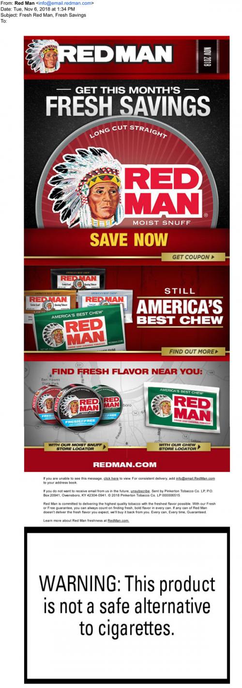 Red Man email from November 2018 linking to claim monthly coupons and use a store locator on the brand website.