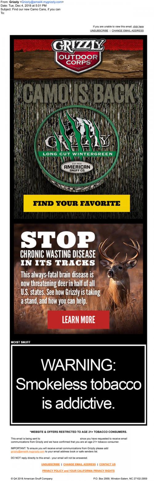 Grizzly email in December 2018 promoting their camo cans and an Outdoor Corps article about chronic wasting disease and how the brand is trying to protect hunting populations.