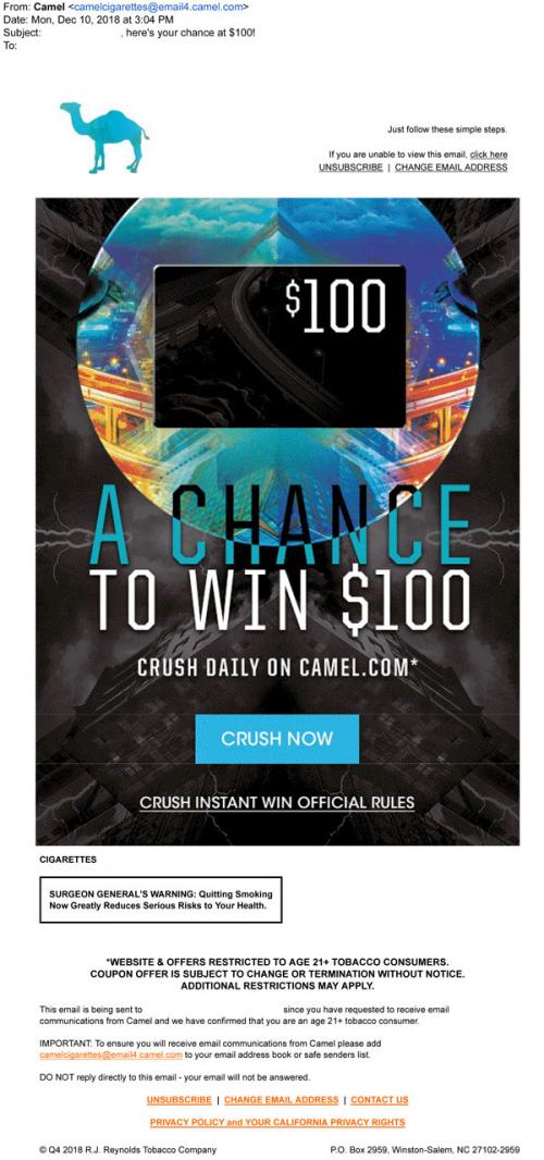 Camel email in December 2018 promoting the Crush sweepstakes, with a link to the brand website to enter.