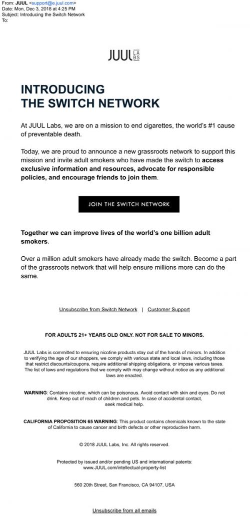 Email from JUUL in December 2018 introducing the "Switch Network," an online grassroots hub to support smokers switching from combustible cigarettes. The site will give access to information and resources, as well as advocacy tools to support e-cigarettes.