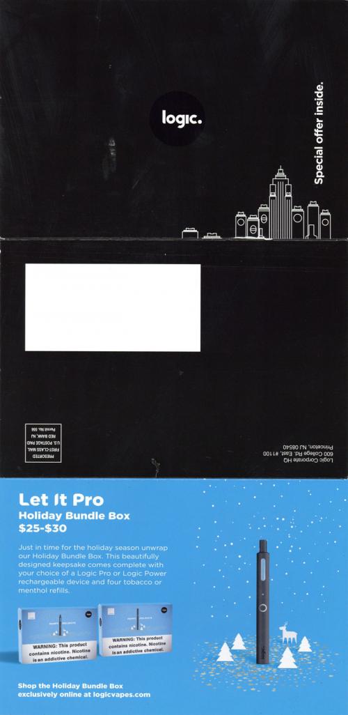 Direct mail from Logic received in December 2018 that promotes holiday bundle sales and delivers coupons. Advertises the various product styles the brand offers.