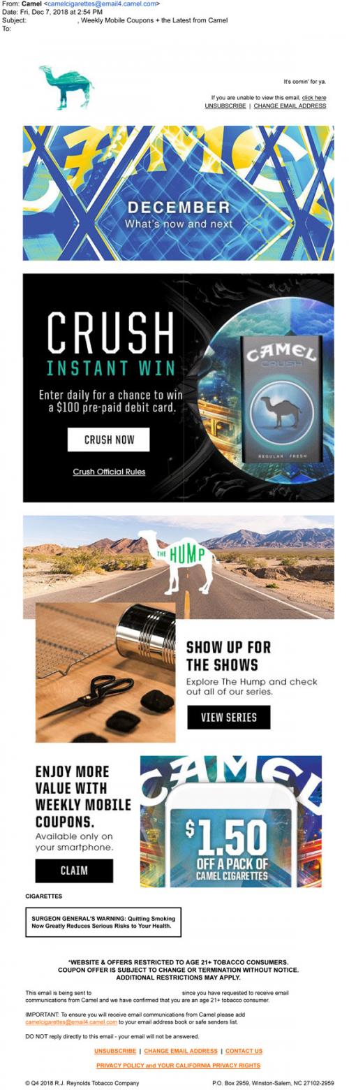 Email from Camel in December 2018 that promotes the Crush instant win game, the various shows to watch on The Hump, and the availability of weekly mobile coupons to claim.