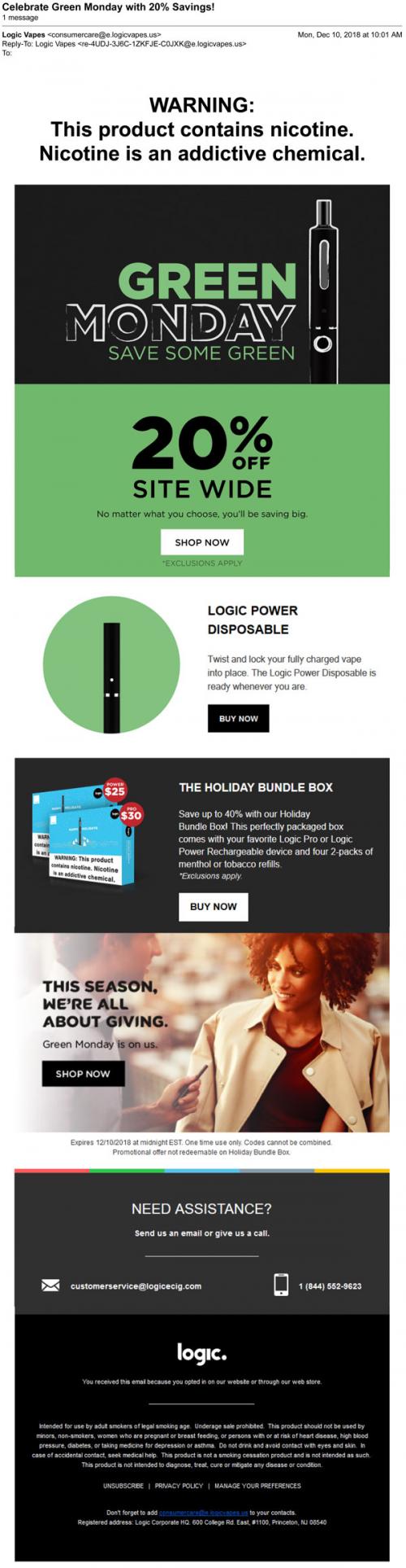 Email from Logic in December 2018 promoting a Green Monday sale through the brand website, along with holiday bundle savings.