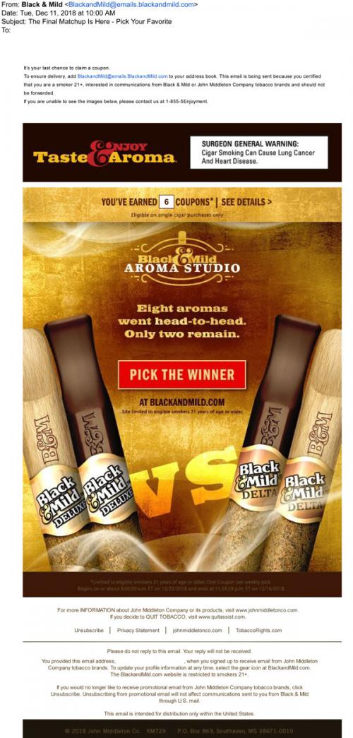 Black & Mild email in December 2018 promoting the final vote of the Aroma Studio decision on which cigar to feature in stores. Players get a coupon for every vote they make on the brand website.