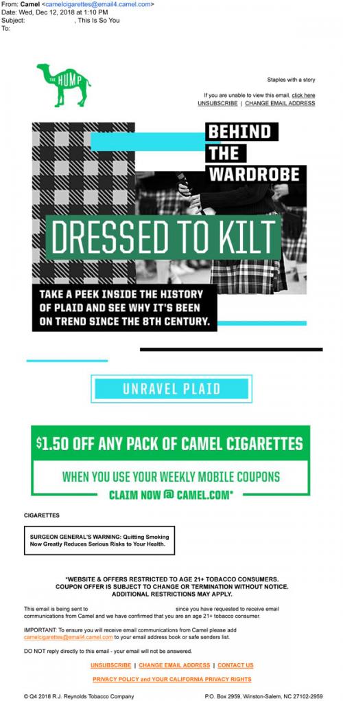 Camel email in December 2018 introducing a new episode of Behind the Wardrobe to watch on The Hump feature. Also promotes weekly mobile coupons.