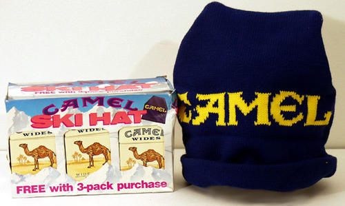 "Camel ski hat free with 3-pack purchase." Wide filters. Mountain scene on box. Catalog volume 3 included.