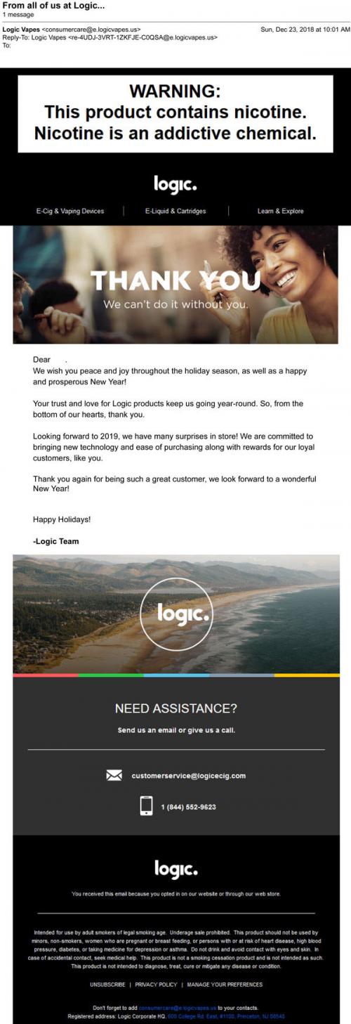 Email from Logic in December 2018 wishing the recipient a happy New Year and thanking them for being a loyal customer.