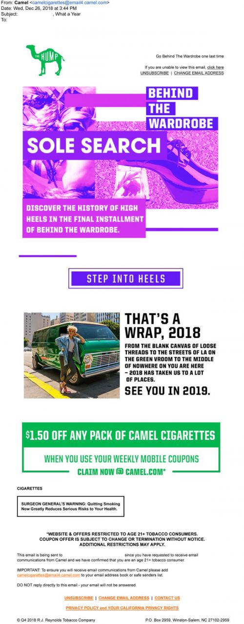 Email from Camel in December 2018 with a new episode from Behind the Wardrobe and a wrap up of shows seen on the Hump feature this year. Also promotes weekly mobile coupons.